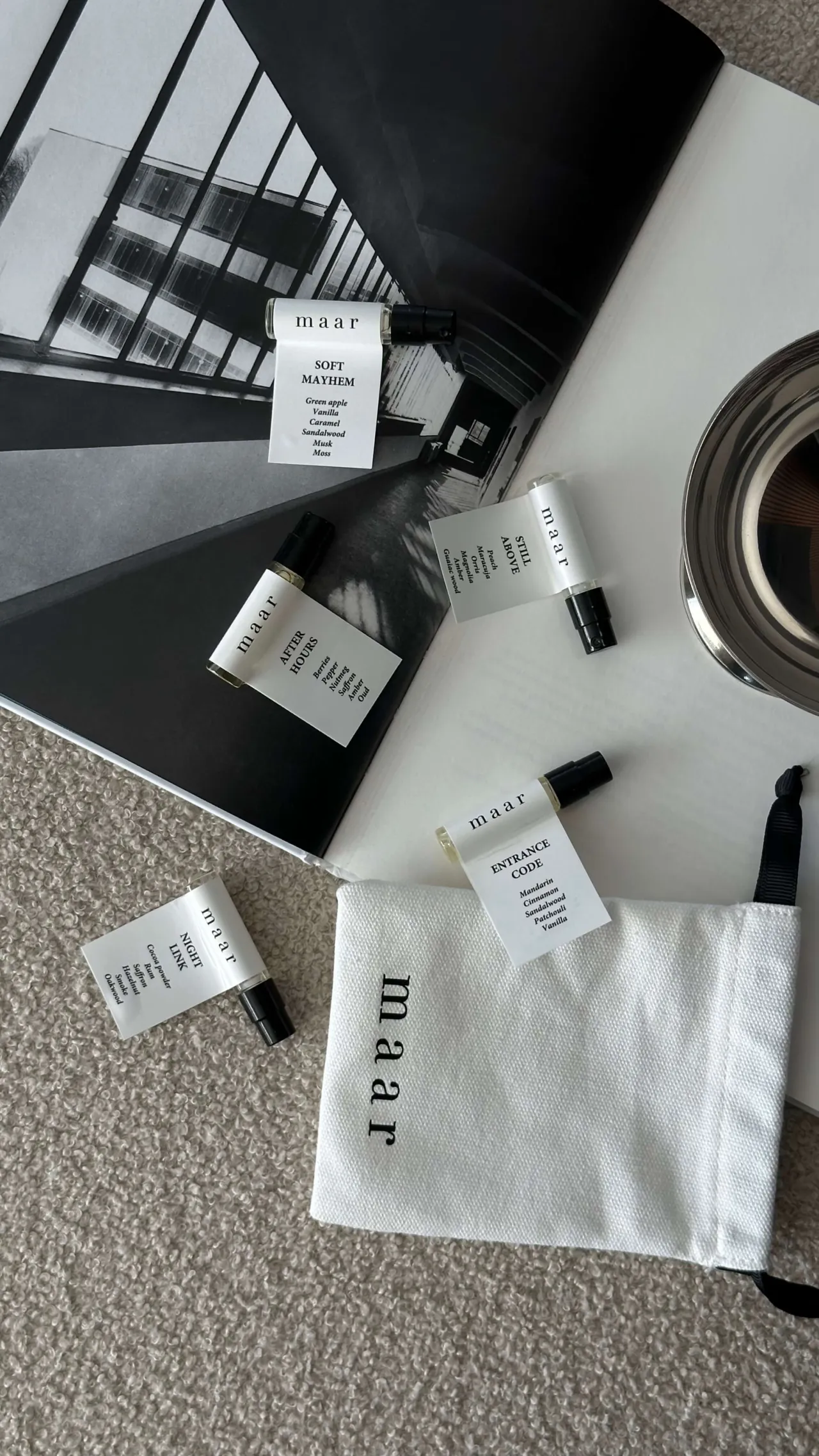 Šis limituoto leidimo rinkinys sukurtas naujai kolekcijai atrasti ir apima penkių jos kvepalų ekstraktų mini versijas: STILL ABOVE, SOFT MAYHEM, ENTRANCE CODE, AFTER HOURS ir NIGHT LINK. Išbandyk juos ir pajusk, kuris kvapas labiausiai atliepia tavo dabartinį gyvenimo ritmą. Pilno dydžio buteliukai jau netrukus.